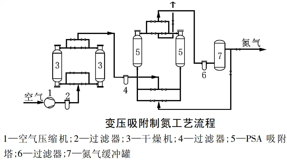 Ambient air is compressed and purified (to remove oil, water and dust), then enters the PSA unit consisting of two carbon molecular sieve adsorption towers. The purified compressed air flows through the adsorption tower from bottom to top: oxygen molecules are adsorbed by the carbon molecular sieve, while nitrogen is discharged from the top of the tower and stored in the crude nitrogen buffer tank. When the carbon molecular sieve in the tower is saturated with adsorbed oxygen, the sieve is regenerated (desorbing the adsorbed oxygen) by stopping adsorption and reducing the pressure in the tower. The two adsorption towers alternately perform adsorption and regeneration to ensure continuous and stable nitrogen output.
