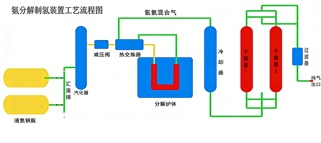 Gaseous ammonia from ammonia cylinders or tanks is depressurized through an ammonia pressure reducing valve. The reduced-pressure ammonia gas passes through a heat exchanger to exchange heat with cracked gas, and then is sent into the cracking furnace (filled with activated nickel catalyst inside). Ammonia is cracked into hydrogen-nitrogen mixed gas at 800℃. The high-temperature hydrogen-nitrogen mixed gas enters the heat exchanger again to exchange heat with gaseous ammonia, cooling down the cracked gas while recovering heat to heat up the gaseous ammonia. After heat exchange, the cracked gas is further cooled in a cooler before being sent to the point of use.