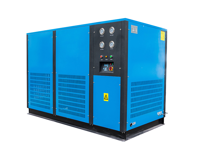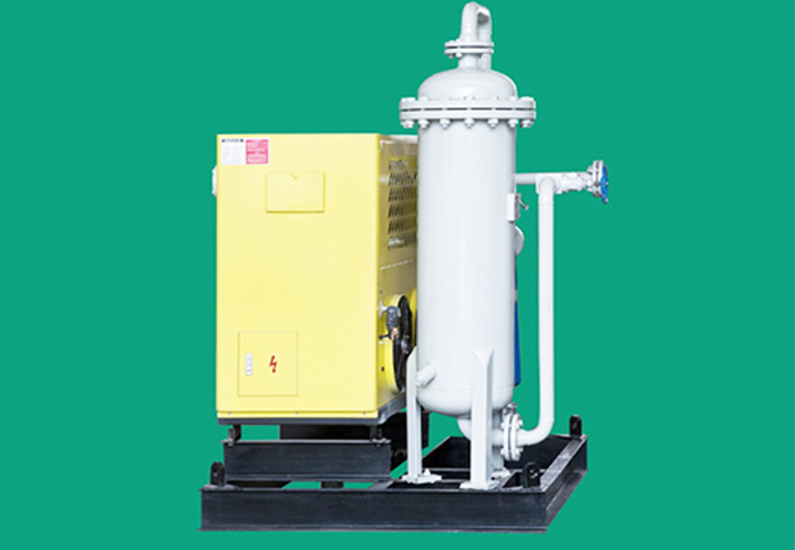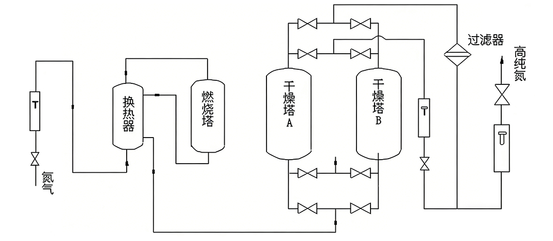 氮气纯化系统能根据氧分仪持续测出的实际含氧量,自动调节进入原料气中的配气量。为了使多余氢达到最小值,提高氮气纯度,系统配有高精度、高性能的氢气控制模块。混合气进入一催化反应器,在反应器内氢气与氧气发生放热反应,转化为水蒸气。经冷凝形成水后进行脱出。氮气经吸附干燥器干燥,最终得到洁净干燥的氮气产品。